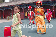 身穿清代服裝的游客七月四日在北京故宮午門前準備拍照。隨著北京故宮旅游的逐漸復蘇,受非典影響停業兩個多月的古裝攝影也開始恢復營業。中新社記者 張煒 攝