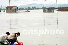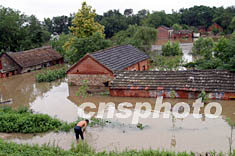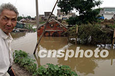 七月四日,安徽淮河分洪仍在繼續,不少淮河岸邊低洼地區的房屋被水淹,一位房屋的主人不忍再看被淹的房屋。中新社記者 盛佳鵬 攝
