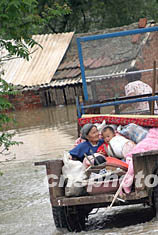 七月四日,安徽阜陽縣一戶農民全家乘坐拖拉機轉移到高地。由于安徽淮河分洪,部分低洼地區的房屋被淹。中新社記者 盛佳鵬 攝