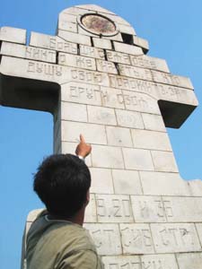 這座由沙俄建立的紀(jì)念碑呈十字架形,高6米,寬0.7米,以灰白色花崗巖砌筑,碑的上端鑲嵌著圓形彩色“圣母”頭像,下面鐫刻著俄文。日期為1904至1905年,即“日俄戰(zhàn)爭”的時間。