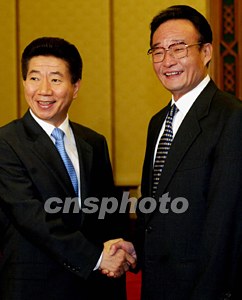 全國人大常委會委員長吳邦國八日在北京會見正在北京訪問的韓國總統盧武鉉一行。中新社記者:鄭萍萍