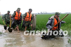 清晨趕到焦崗湖大堤的南京軍區(qū)某集團(tuán)軍官兵,連營(yíng)房都沒進(jìn),就沖到了一線,為焦崗湖防險(xiǎn)搭起了第二道堤防線。