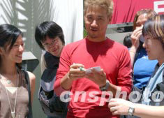 香港歌星張學(xué)友,七月十二日接受香港新城電臺“家天下”節(jié)目專訪,等候的歌迷爭相請張學(xué)友簽字。中新社傳真 錢興強 攝