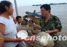 安徽省穎上縣半崗鎮(zhèn)空臺(tái)村的一千多名男女老少,因邱家湖七月十二日破堤行洪而被洪水四面圍困,災(zāi)民們吃的是用發(fā)霉的麥子做的面餅,不少人吃后都肚子痛。圖為災(zāi)民讓乘船前來(lái)看望的解放軍軍分區(qū)指揮員嘗一口這種面餅。中新社記者:賈國(guó)榮