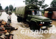 解放軍南京軍區急調軍車,向七月中旬淮河行洪區的安徽省阜陽地區運送救災品。當地農村到處是內澇洪水,車隊涉水直奔災區。作者:閆宏宇