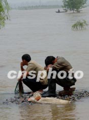 今夏淮河洪水淹沒千里漁米之鄉的魚塘,養魚農民血本無歸。安徽省阜陽縣王家壩的漁民和村民目前抓緊撒網捕撈流失之魚,略補生活損失。中新社記者:賈國榮