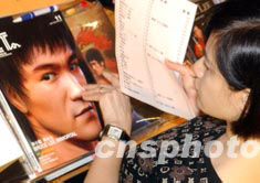 圖為展會上參觀者購買李小龍紀念雜志。