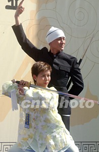 香港巨星劉德華、武術名家李暉,七月十九日在香港舉行的“諾基亞6108揮筆舞劍創記錄”慈善活動上,率五百人寫書法及耍太極劍齊創健力士記錄。中新社記者:錢興強