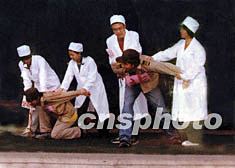 北京首都醫科大學的大學生們,近日在學校大禮堂舞臺演出活報劇《抗“非典”》。圖為身穿醫療防護裝的“醫護人員”將“非典病毒”捉拿歸案,以示正法。作者:首醫