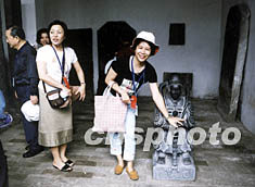 長江三峽蓄水后吸引了許多人的關(guān)注。七月中旬,一百多位臺灣游客來到夔門參觀游覽。圖為臺胞在白帝城東碑林撫摸觀音像,從頭摸到手表示家里樣樣有。作者:李中全