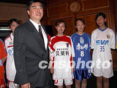 中國足球協(xié)會副主席兼秘書長閹世鐸和各報名參賽俱樂部的代表在一起。中新社記者:張勤