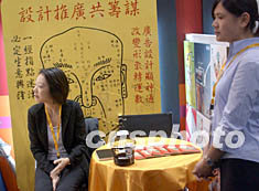 香港家庭用品、禮品及贈品綜合展,七月二十三日在香港會展中心開幕,圖為展會上一廣告商以看相指點迷津吸引參觀者。中新社記者:錢興強