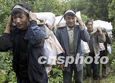 來自政府和民政部門的救災物資二十三日陸續抵達云南大姚縣,救災人員經過崎嶇險要的山間小路為地處震中的小興廠村災民運送物資。中新社記者:毛建軍