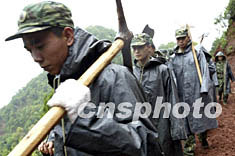 解放軍官兵二十三日冒雨前往受災嚴重的云南省大姚縣曇華鄉山區,參加抗震救災。中新社記者:毛建軍