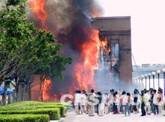 一個風和日麗的日子里,M國駐廣州領事館門前人們在悠閑地交談、漫步,突然,轟隆一聲巨響,只見領事館窗口濃煙滾滾,頃刻大火蔓延,驚慌的人們四散逃開,哭聲、喊聲、呼救聲夾雜一片,一些民眾則被困在領事館的天臺顯得非常無助……