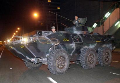 圖:菲律賓政府軍裝甲車圍住兵變士兵占領區