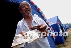 溫家寶總理七月十二日在安徽省阜南縣王家壩看望的七十二歲災(zāi)民鄭治學(xué),原來是抗美援朝老戰(zhàn)士,他至今在救災(zāi)帳篷里保存著當(dāng)年志愿軍彭徳懷司令員和朝鮮金日成將軍的圖片等紀(jì)念品。中新社記者:賈國榮