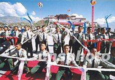 “八一”前夕,武警西藏總隊組織駐拉薩部隊官兵在布達拉宮廣場舉行“慶祝建軍七十六周年藏歌藏舞文藝匯演”,千余名武警官兵和藏族群眾跳起大型鍋莊舞,布達拉宮廣場成了歌舞的海洋。作者:趙艷志