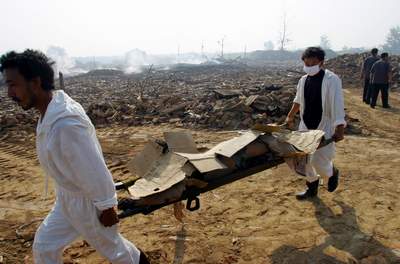 圖:醫務工作者搶運辛集爆炸煙花廠遇難者