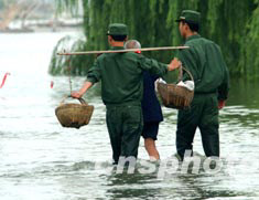 安徽省今夏七月的淮河洪水漸漸退落,兩名武警戰士在壽縣護送一位老年災民返鄉。作者:阜軍