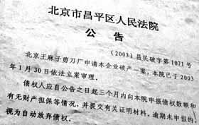 王麻子剪刀廠申請破產(chǎn)后,按照相關(guān)法律程序,法院在立案后,將有3個月的公告期,最終依法宣告破產(chǎn)。在破產(chǎn)清算后,用剩余資產(chǎn)安置職工、還貸、還債。宣告破產(chǎn)后,“王麻子”可以甩掉多大的經(jīng)濟(jì)包袱,廠方?jīng)]有明確的答復(fù),但他們認(rèn)為更重要的是多年來“剪不斷理還亂”的歷史問題該有個說法。(據(jù)《每日新報(bào)》)