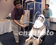 香港科技大學31日舉行流動呼吸感染控制裝置簡介會,該裝置適用于醫院病房及救護車,可以確保醫護人員在治療“非典”等傳染病病人時,免受感染。圖為科大安全及環保處高級工程師俞宗岱博士(左)進行現場示范。作者:謝育元