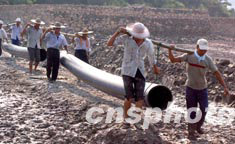 浙江玉環(huán)縣的淡水資源本來就十分緊缺,持續(xù)一個(gè)多月的旱情更是火上澆油,使該縣60%的人口(約30萬人)飲用水發(fā)生困難。為此,玉環(huán)縣緊急撥出1450萬元,鋪設(shè)17公里長(zhǎng)的跨海穿河管道,實(shí)施北水南調(diào)。8月1日,施工人員冒著酷暑在灘涂下埋設(shè)水管,爭(zhēng)取早日完工。作者:鐘袁