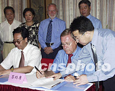 “二00三年全國鄉鎮企業東西合作經貿洽談暨產品展銷會日前在中國旅游標志“銅奔馬”的故鄉甘肅武威閉幕。貿洽會共簽約項目七百四十五個,總投資一百六十六點七億元人民幣,引進資金一百四十三點三億元。圖為歐盟中國協會秘書長畢加和、法中協會主席稚克·溫明登先生分別與甘肅省有關部門就相互合作事宜簽約。作者:楊曉波