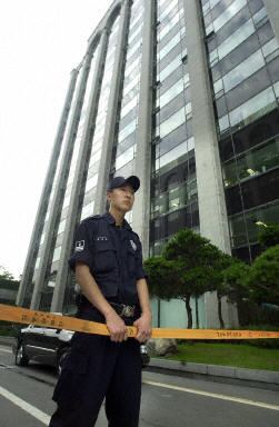韓國現代集團牙山公司董事長鄭夢憲在漢城市中心的辦公樓自殺現場。