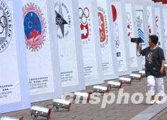 北京2008年奧運會徽八月三日夜大白天下后,引發中國民眾的關注。一名市民用攝像機拍攝下歷屆奧運會會徽的宣傳畫。中新社記者:賈國榮