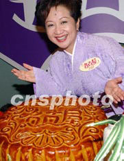 香港電臺著名節目主持人薛家燕,八月五日在香港舉行的“美食與中醫藥博覽會”新聞發布會上,為一家食品商推出“月餅王”。中新社記者:錢興強