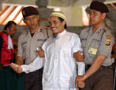 印度尼西亞一家法庭8月7日宣布一名伊斯蘭武裝分子阿姆奧茲(中)在巴厘島爆炸案中犯下的恐怖罪罪名成立,并判決他死刑。去年10月12日,印尼旅游勝地巴厘島一家夜總會發(fā)生爆炸,造成200多人死亡,330多人受傷,其中多數(shù)為外國游客。