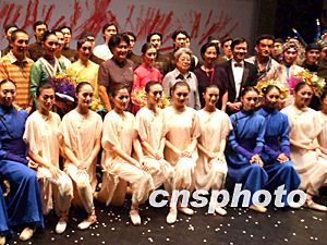 中國副總理吳儀八月十日晚觀看中央芭蕾舞團新版《大紅燈籠高高掛》,與導演張藝謀和創作演出人員合影祝賀首演成功。中新社記者:賈國榮