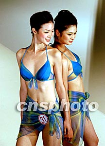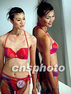 2003年“維倚”南方新絲路模特大賽復賽,8月10日在廣州美博城舉行,123名選手參加了角逐。分三個環節《迷你炫風》、《出水芙蓉》、《國色天香》之經典麗人行。圖為迷人誘惑泳裝顯示出女性的美。作者:劉衛勇