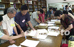 原定于六月進行的中國普通高等學校二零零三年招收華僑、港澳、臺灣省學生考試,因受“非典”影響改于本月十五日至十七日進行,圖為澳門考區的監考老師們在考試結束后當場封卷。中新社記者:李剛