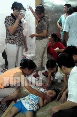 8月15日晚,在江西省弋陽縣人民醫院的走廊里,家長們照顧在墜樓事故中受傷的孩子。