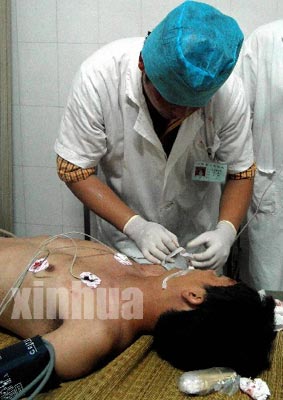 8月15日晚,在江西省弋陽縣人民醫院,醫生正在搶救墜樓事故中受傷的市民。
