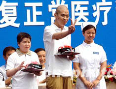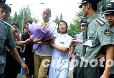 中國最后兩名非典病人孫錚(中)和盧志艷(左一),八月十六日上午于北京地壇醫院康復出院,并向醫護工作者告別。中新社記者:鄒憲