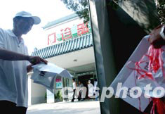 北京地壇醫院八月十六日送走最后兩位非典患者康復出院,撤銷紅色隔離線恢復門診。中新社記者:賈國榮