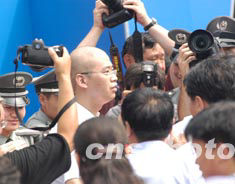 北京最后兩位非典患者八月十六日從地壇醫院康復出院,他們被護送出席歡送儀式。中新社記者:賈國榮