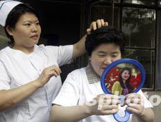 8月16日清晨,中國(guó)最后康復(fù)出院的SARS患者盧志艷在北京地壇醫(yī)院ICU病房護(hù)士長(zhǎng)劉小冬幫助下精心梳妝準(zhǔn)備參加出院慶典儀式。盧志艷是北京小莊醫(yī)院藥劑師,4月25日感染SARS住院治療時(shí)間長(zhǎng)達(dá)112天。中新社記者:任晨鳴