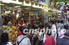 近日來澳門旅游觀光的客人急增,圖為星期天在澳門(乙加水)仔著名老城區官也街里,來自香港和內地的游客熙熙攘攘購買具有澳門特色的食品。中新社記者:李剛