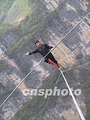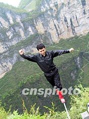 阿迪力二十八日在重慶奉節小寨天坑成功試走橫跨天坑、總長800米的鋼絲。作者:盛佳鵬