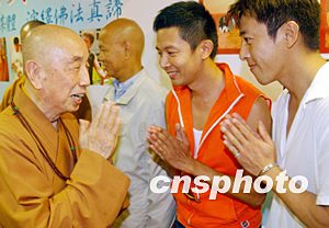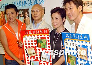 由星加坡福海禪院與好合拍多媒體集團合作出版的《拈花笑語系列》光盤發布會八月十八日在香港舉行,圖為明義法師(左)與香港藝員何寶生(中)、呂頌賢(右)在新聞發布會上。中新社記者:錢興強