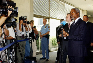 由于聯合國駐伊拉克辦事處19日遭汽車炸彈襲擊,安南決定立即中止在芬蘭的休假返回聯合國總部。他在斯德哥爾摩作短暫停留時舉行的記者招待會上說,無論是對聯合國,還是對伊拉克或整個國際社會,這都是一個“黑色的星期二”,“但我們將繼續我們的工作,至少我們有責任不能讓在炸彈襲擊事件中死亡的人白白地犧牲”。