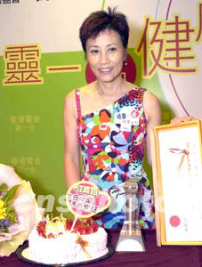 影視紅星汪明荃8月26日出席香港電臺節目“精靈一點‧健康一點”記者會,曾患癌癥的汪明荃將擔任節目主持,將向聽眾提供癌癥的信息。圖為汪明荃快將生日獲港臺送上生日蛋糕、鮮花等禮品。作者:鄧慶樂