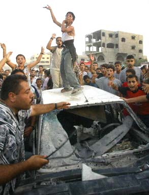 憤怒的巴勒斯坦人圍在被導彈襲擊的汽車周圍高喊反以口號