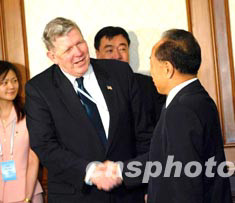李肇星外長與韓、日、朝、俄、美代表團團長及大使等一一握手、寒暄,大家很配合地擺出好的角度,讓少數(shù)獲得特許進來采訪的記者們拍照。