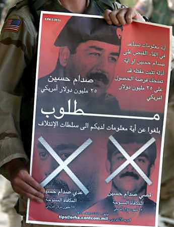 美軍士兵和伊拉克警察到處張貼懸賞捉拿薩達(dá)姆的海報時引來了眾多巴格達(dá)市民的圍觀。圍觀的人群當(dāng)中對捉拿薩達(dá)姆一事各有各的看法,一名現(xiàn)年23歲的伊拉克牙科醫(yī)生海德爾·阿里表示:“我認(rèn)為他們遲早會捉到薩達(dá)姆的,但有一些人似乎不知道任何有關(guān)這巨額獎賞的事。”