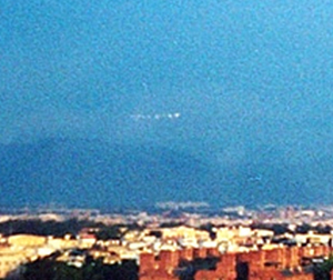 他們上樓后,在火星方位的東南方上下尋找火星蹤跡,由于天色仍亮,找不到火星,但突然在同方位的下方遠處;大溪鎮后方山區上空,發現一排發著金黃色光彩的橢圓形飛行物緩緩移動,方向由東南方往西前進,數量大約是10余架,有3架好象是帶頭的,一架在最前,后面兩只是上下排列,狀似三角形。帶頭的三架并一度90度轉彎消失,約三秒后又突然出現與機隊會合,隨后再整隊緩緩前進,消失在云霧中。
